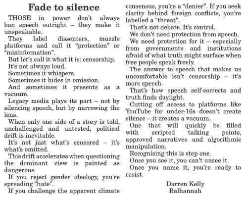 And all the while, legacy media plays its part — not by silencing speech, but by narrowing the lens. When only one side of a story is told, unchallenged and untested, political drift is the inevitable outcome. It’s not just what’s censored and stigmatised that shapes the narrative — it’s what’s omitted.